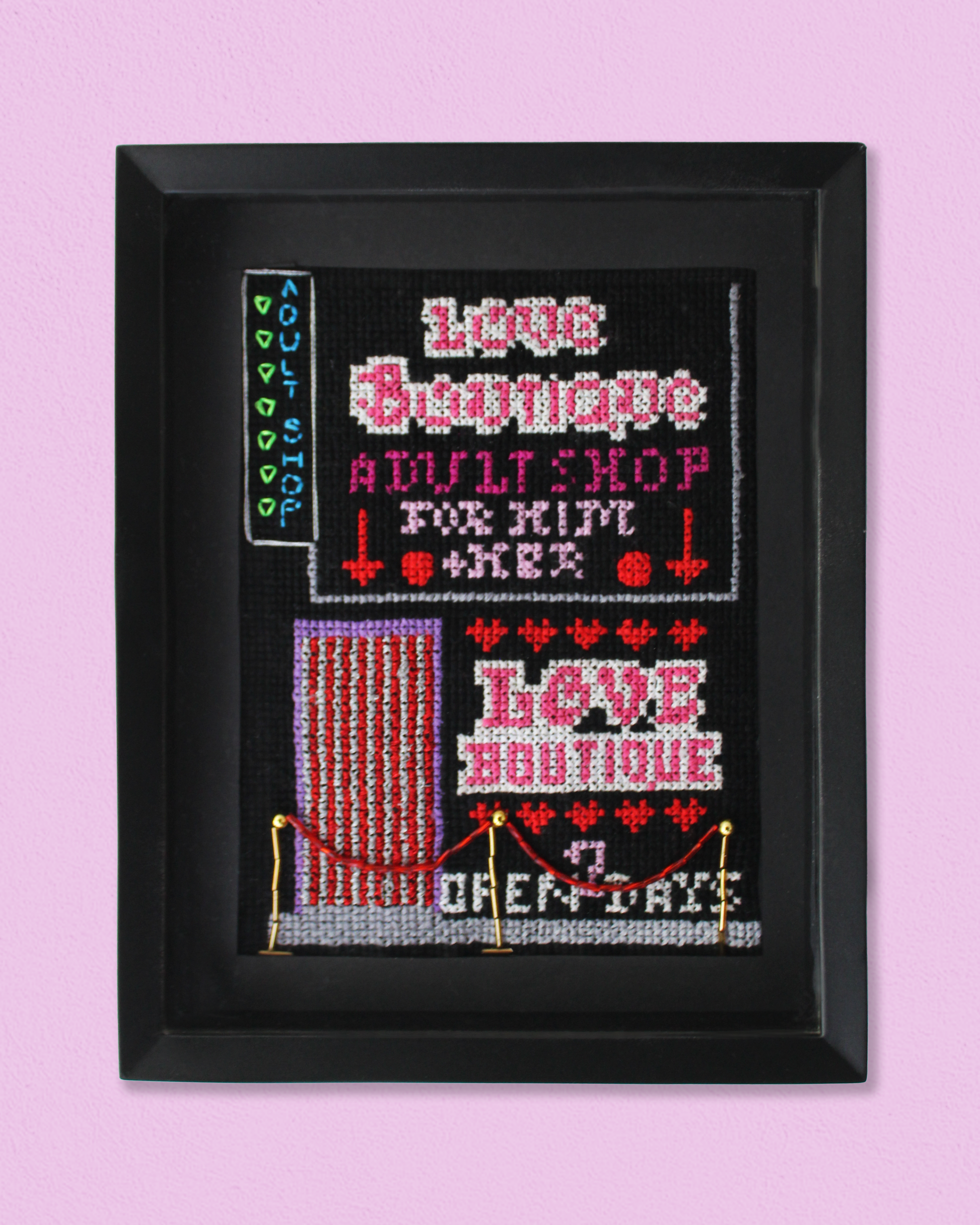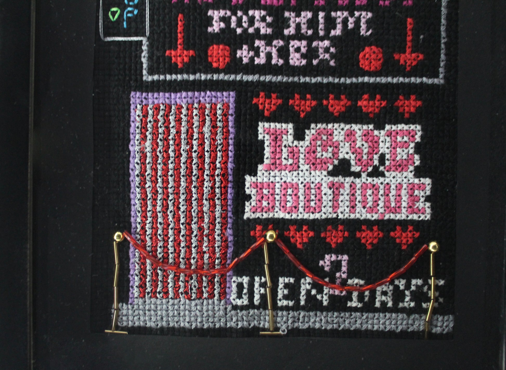 3D MINIATURE STITCHED RECREATION OF ADULT SHOP IN MANCHESTER UK WITH LITTLE BEADED VELVET ROPE.